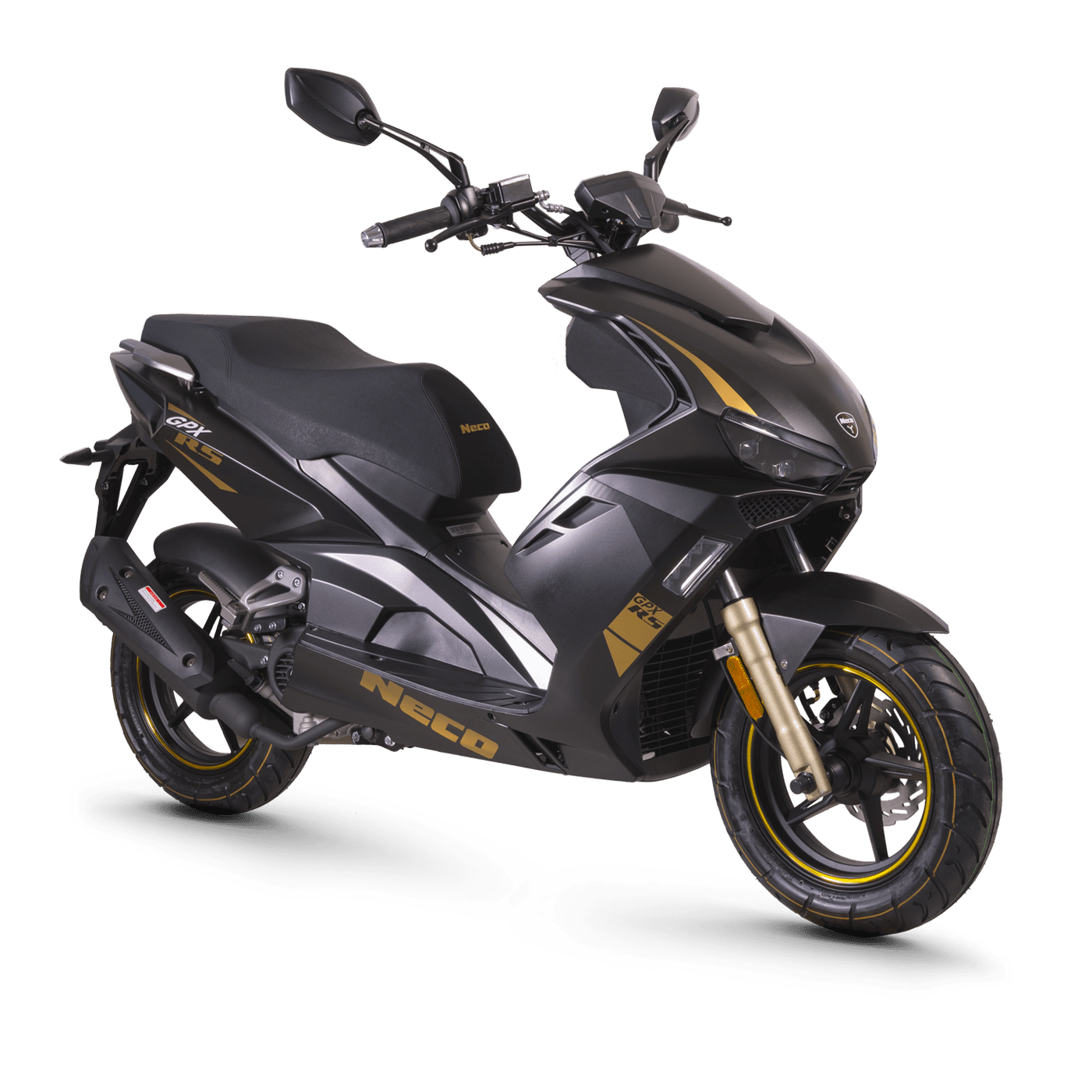 The new NECO GPX RS combines sportiness and elegance with its exposed handlebars and matte black fairings, enhanced by carbon‑effect inserts and matte gold accents. The minimalist cockpit, equipped with a backlit LCD display, further emphasizes its sporty look. Its sleek and refined design, complemented by wheels with golden stripes, highlights its dynamic character. But the GPX RS is not just about remarkable style: its excellent dynamic qualities make it a scooter that shines as much for its performance as for its aesthetics.