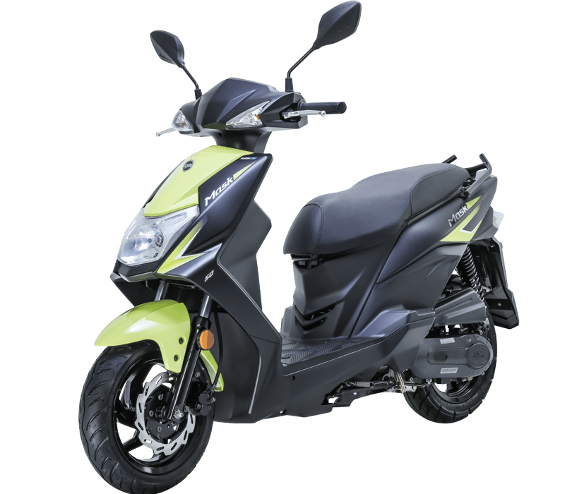 SYM MASK boasts a sporty and refined appearance with its combination of sleek design elements. As an entry-level commuter scooter, the MASK raises the bar for overall quality. One of the major highlights of the MASK is the introduction of SYM's innovative A.L.E.H. system (Anti-Lift Engine Hanger system). This unique engine suspension system helps maintain a steady relative position between the engine and the body of the scooter during acceleration, minimizing any instability caused by lifting. This results in a smooth and stable ride for the rider. In terms of dimensions, the MASK measures at 1900 x 682 x 1120 mm (L x W x H), with a wheelbase of 1290 mm and a curb weight of 107 kg. The front suspension is a telescopic fork, while the rear suspension is a single shock. The front and rear rims are made of aluminium, with tire dimensions of 110/70-12 and 120/70-12 respectively. The front brake type and diameter is a disk Ø 226 mm, while the rear brake is a drum Ø 110mm. The MASK has a fuel capacity of 6.2 L. Under the hood, the MASK features a 4-stroke, single-cylinder engine with a displacement of 49.46 cc. The fuel system is E.F.I. and it complies with the Euro 5 emissions standard.