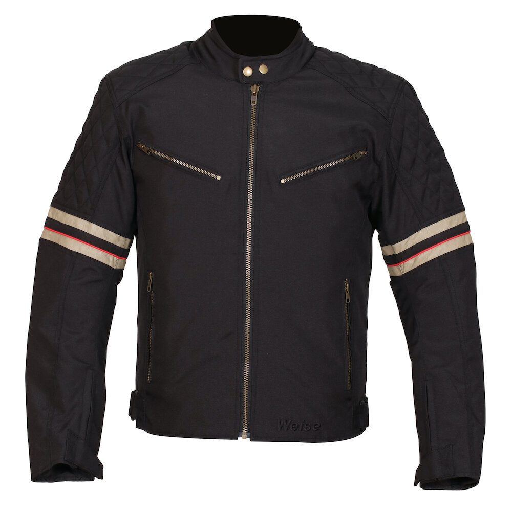 600 Denier polyester outer construction • Removable 120 gram quilted thermal liner • Waterproof, windproof and breathable • Removable CE approved shoulder, elbow and back armour • Diamond quilted styling to shoulders and upper arm • Neoprene® trimmed adjustable collar with popper closure • Adjustable waist with belt system • Adjustable cuff with zipped closure • Four external pockets with zipped closure • Three internal pockets • YKK vintage styled zips throughout • Connection zip to suit jeans with comfort stretch panel